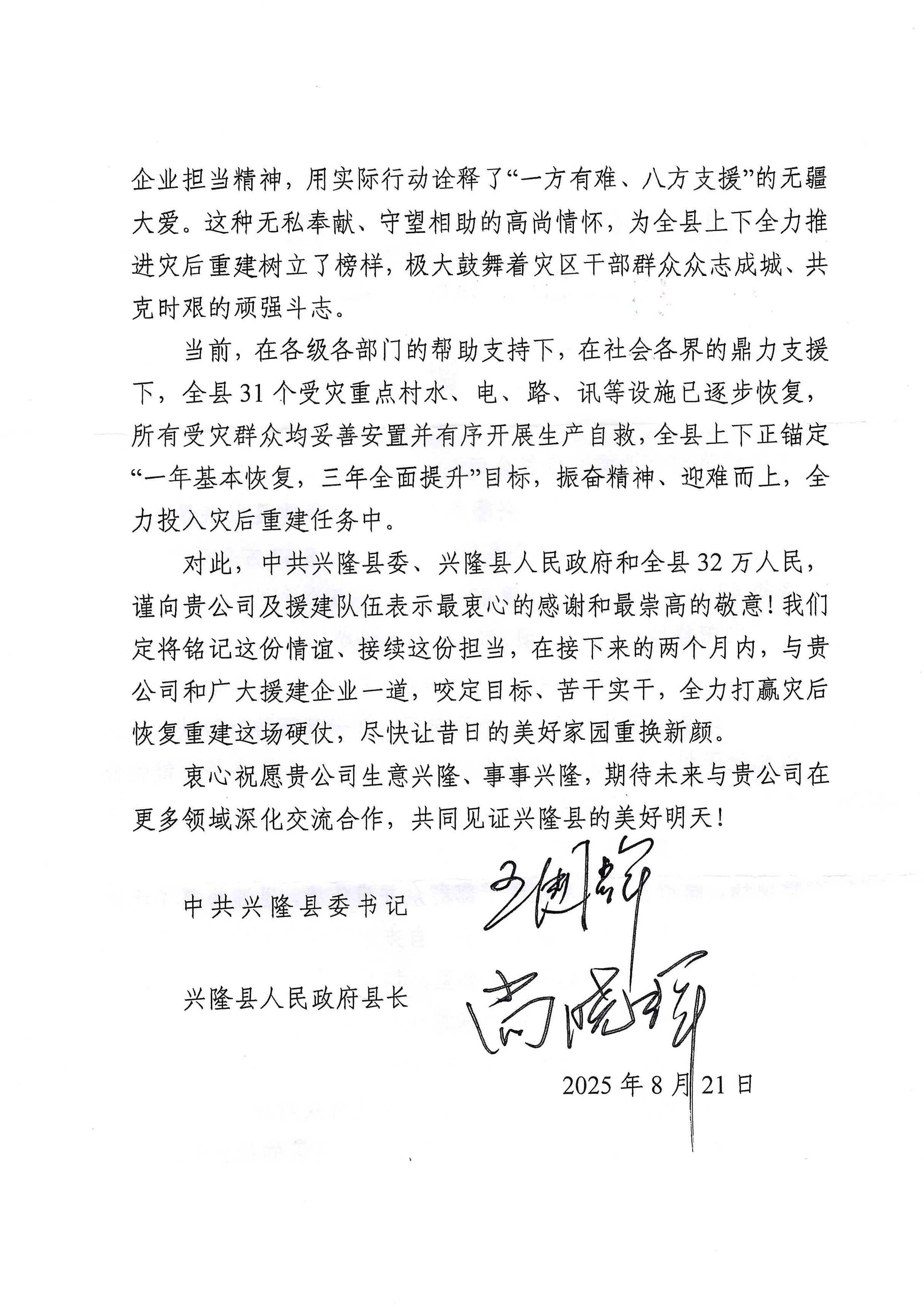 一直以來(lái),板城酒業(yè)積極投身社會(huì)公益事業(yè),始終秉持“服務(wù)社會(huì)、回報(bào)社會(huì)”的企業(yè)宗旨。此次興隆縣的感謝信,再次體現(xiàn)了板城酒業(yè)在社會(huì)責(zé)任踐行方面的持續(xù)擔(dān)當(dāng)。未來(lái),板城酒業(yè)將繼續(xù)秉持企業(yè)擔(dān)當(dāng)精神,在助力地方發(fā)展、參與社會(huì)公益等方面持續(xù)發(fā)力,為社會(huì)創(chuàng)造更多價(jià)值,也期待興隆縣在各方支援下早日重?zé)ㄉ鷻C(jī),共同邁向美好明天。